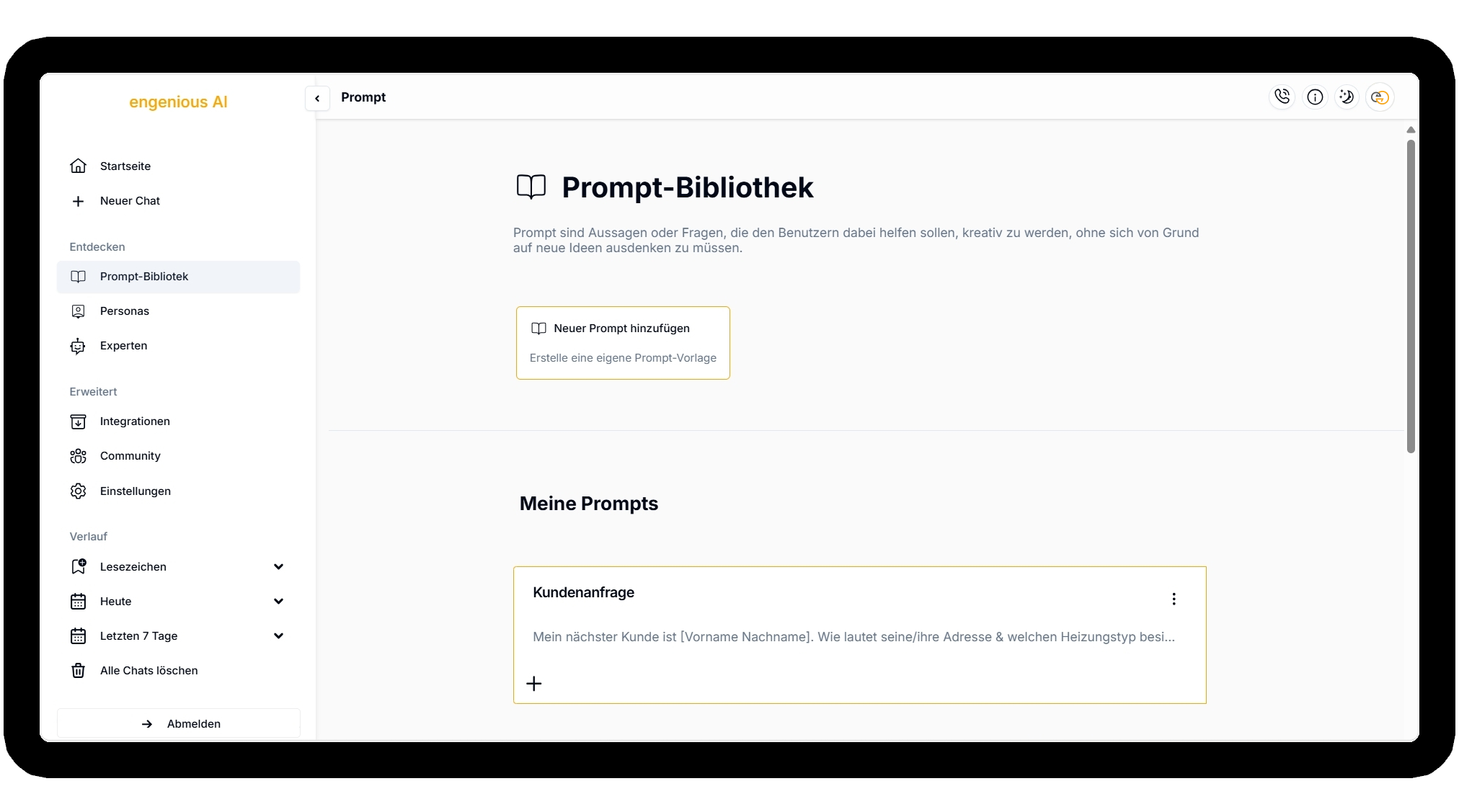 Du bekommst den Zugang auf das engenious AI-Dashboard. Wir integrieren Deine Unternehmensbereiche, Benutzergruppen und Ressourcen, nach deinen Vorgaben.